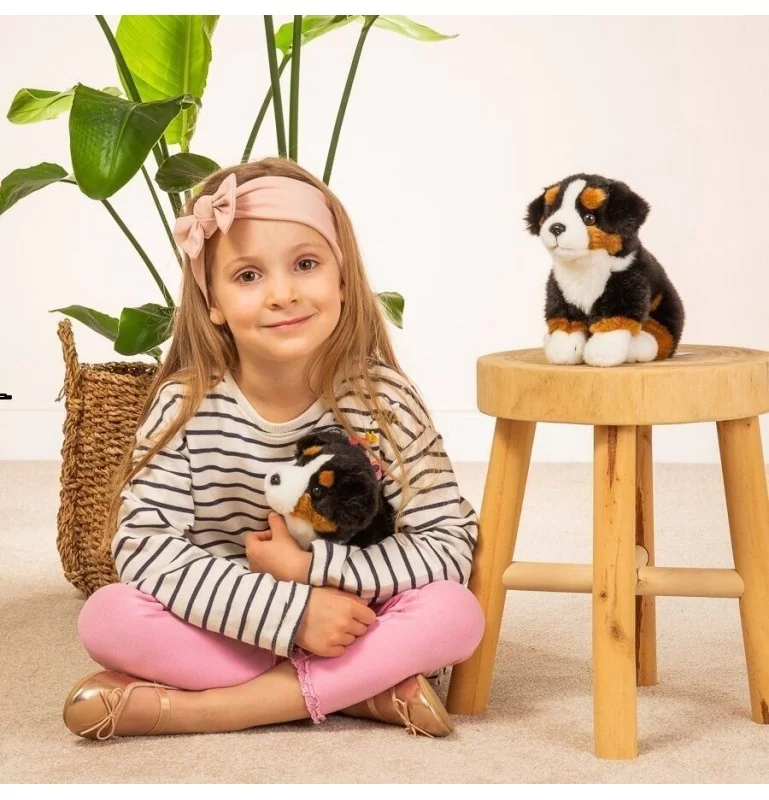 La peluche bouvier bernois assis de la collection Teddy Hermann est très réaliste. Elle possède les taches brunes au-dessus des yeux ainsi que la fourrure noire et blanche très caractéristiques de cette race très appréciée. La peluche de haute qualité vous invite à la câliner. Le rembourrage en PET 100% recyclé fait du petit chien un cadeau durable qui fera plaisir pendant longtemps.