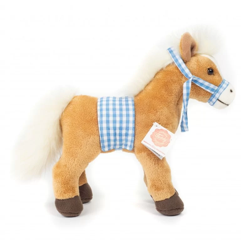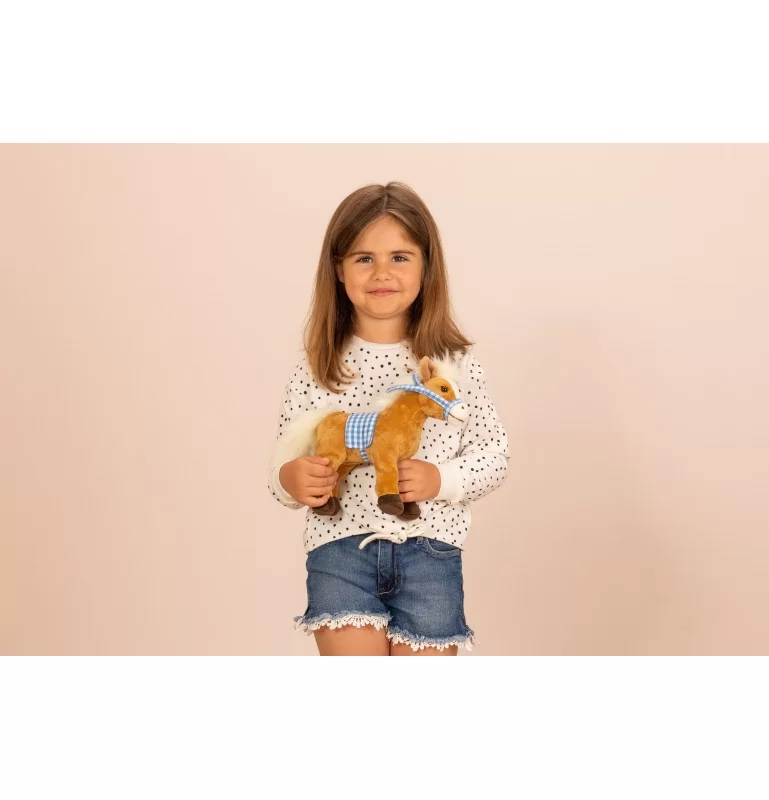 Ce cheval tout doux en peluche est debout et est agrémenté d’une selle et d’un harnais en tissus vichy bleu. Avec sa superbe crinière, il sera le compagnon idéal pour le jeu ou les câlins de tous les enfants amoureux des chevaux.