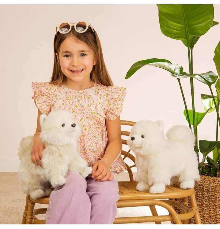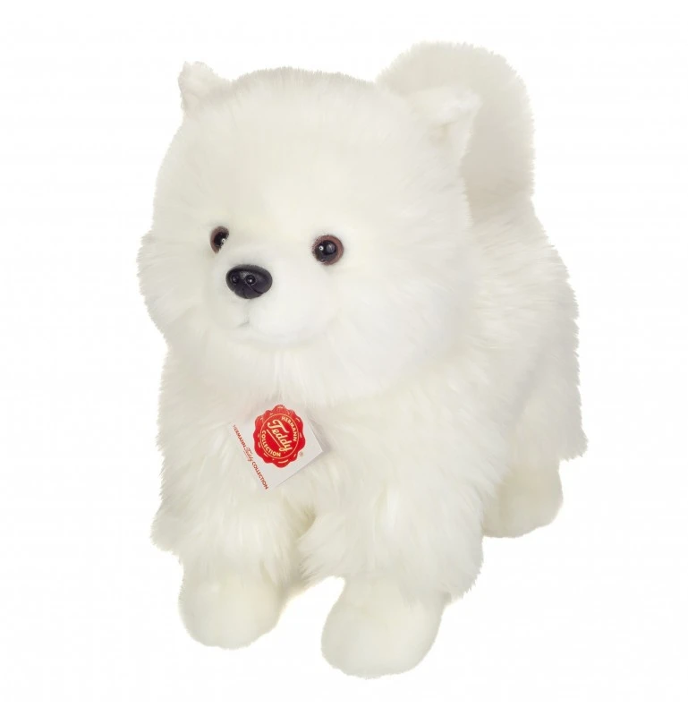 La peluche Spitz nain de la collection Hermann Teddy est très douce et élégante avec sa fourrure blanche comme neige. Son regard affectueux vous fera craquer. Elle plaira également à coup sûr à tous les enfants et les amateurs de chiens. Elle sera un véritable compagnon de jeu et de câlins. Le Spitz nain (appelé aussi Loulou de Poméranie ou Poméranien) est un chien délicat qui a du caractère, qui est très joueur et rayonne de gentillesse.